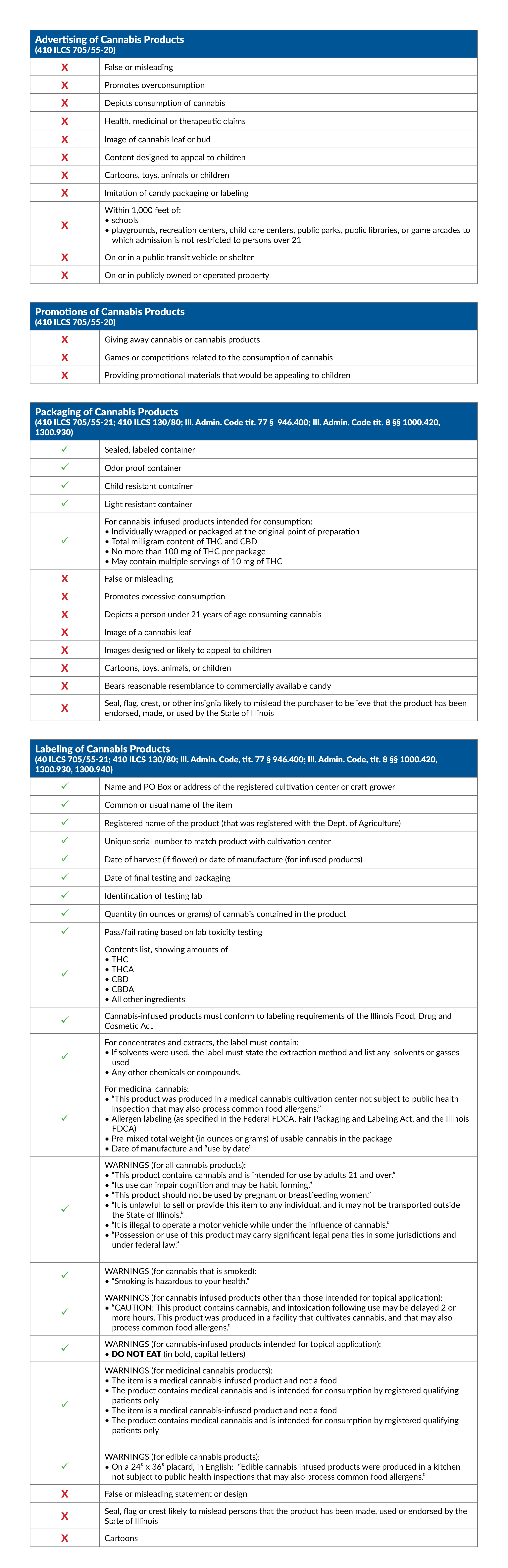 The checklists below summarize some of the most significant requirements and rules relating to the advertising, labeling and packaging of cannabis and cannabis-infused products in Illinois. The green checkmarks reflect requirements, and the red Xs reflect prohibitions.