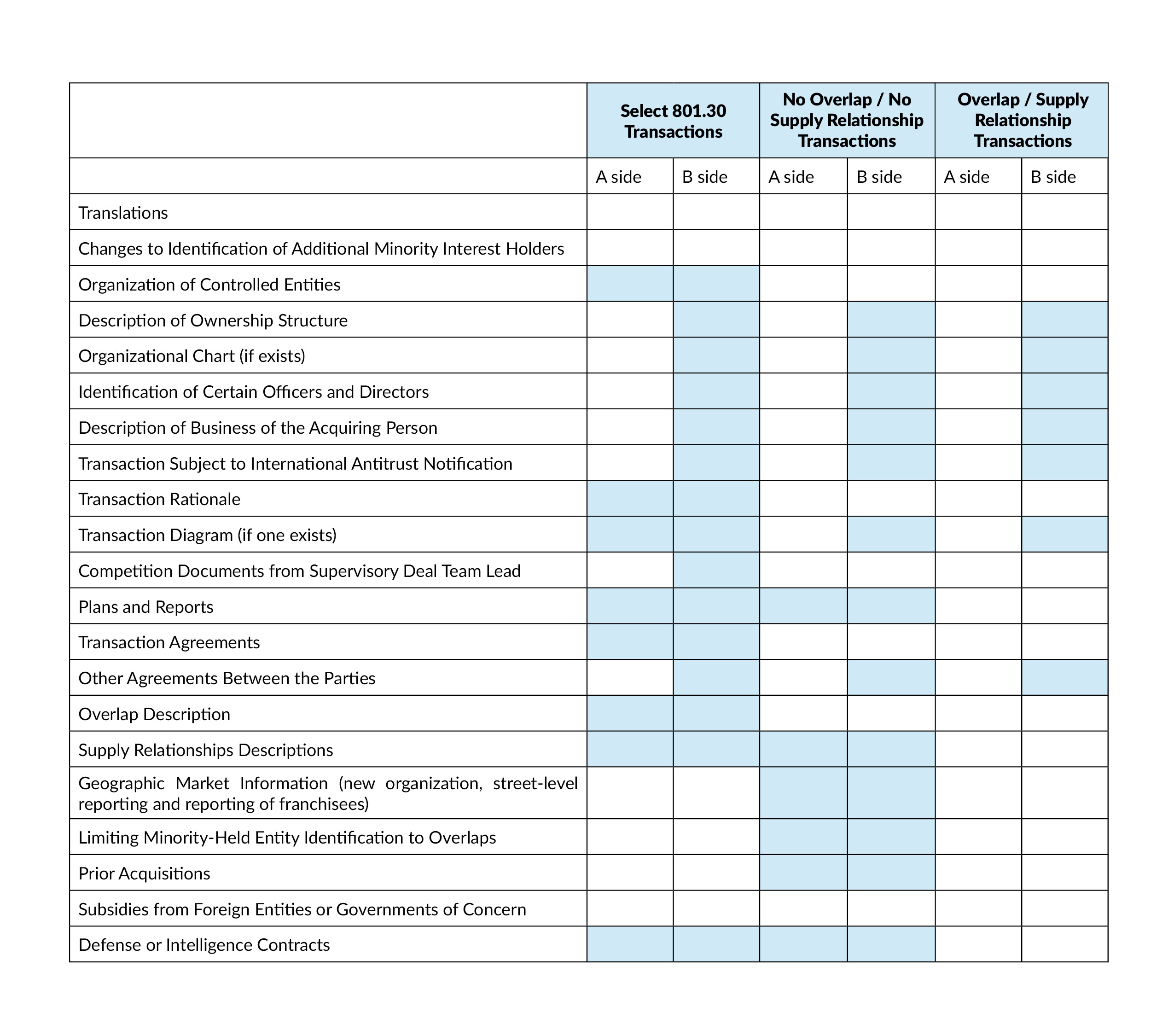 Below is a table published by the FTC summarizing the new information requirements by filer and transaction type.[7]